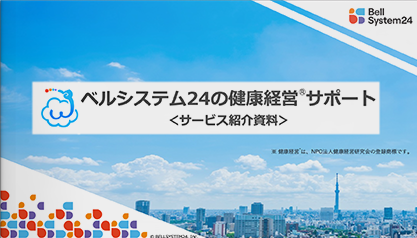 健康経営®を実践していく為の施策支援と、健康経営推進におけるプロジェクト運用支援という2軸ある、ベルシステム24の健康経営サービスについて詳しく紹介しています。